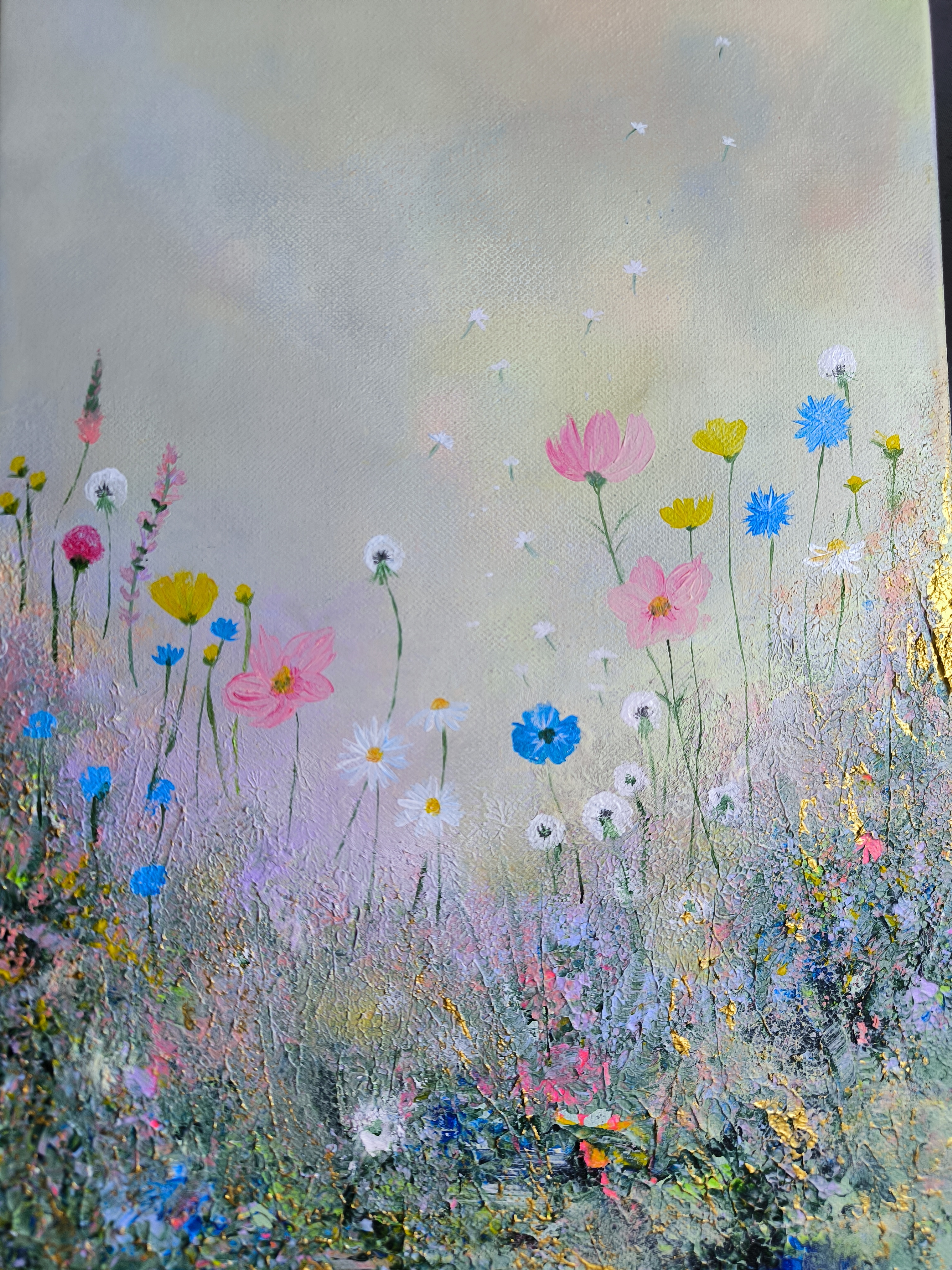 This vibrant and poetic painting captures the delicate beauty of a flower-filled meadow bathed in soft, ethereal light. Created with acrylic on canvas using a textured relief technique, it evokes the essence of spring renewal through a harmonious pastel palette of pinks, yellows, blues, and greens. Wildflowers such as daisies, cornflowers, and dandelions appear to gently sway in a light breeze.