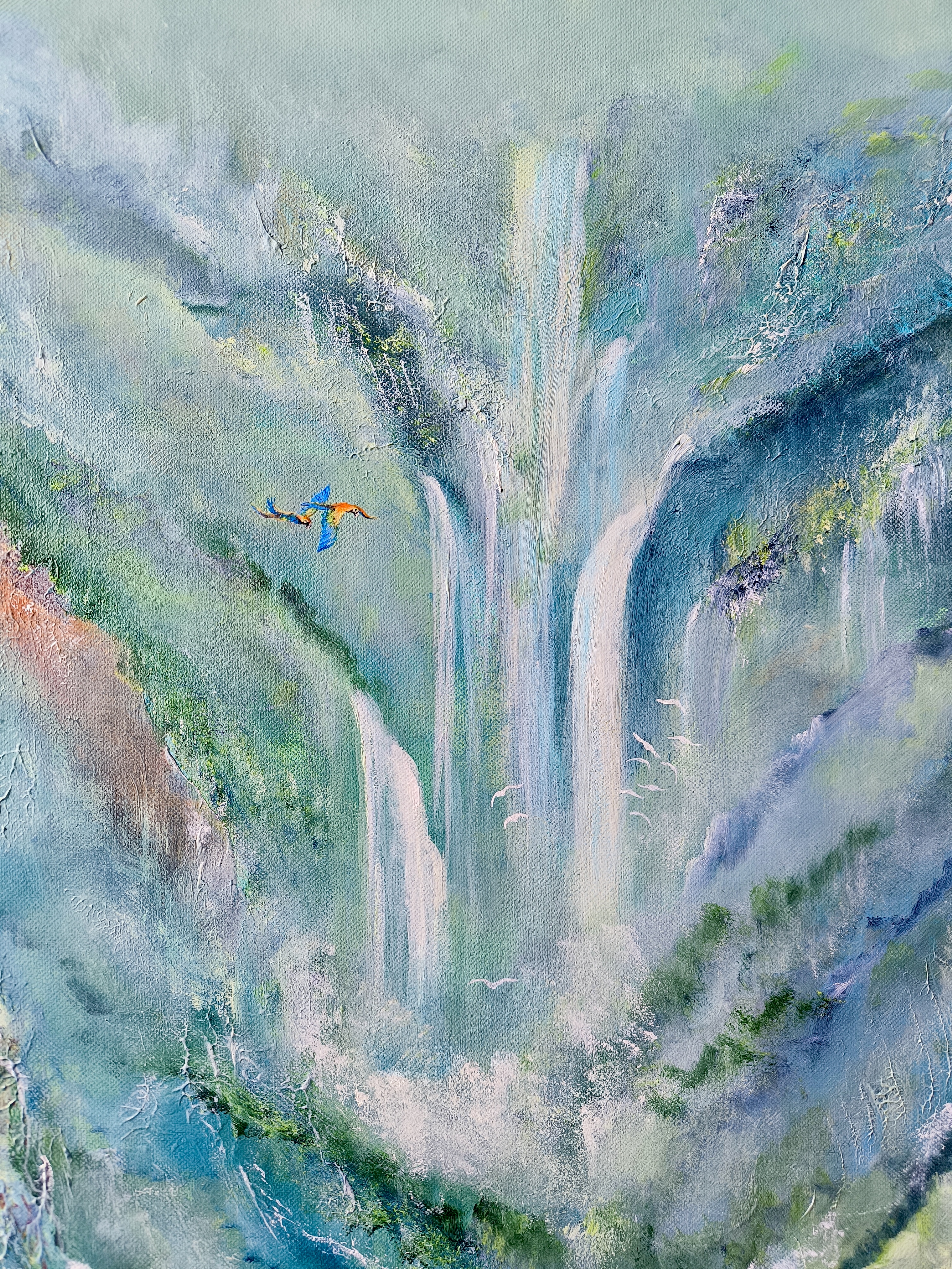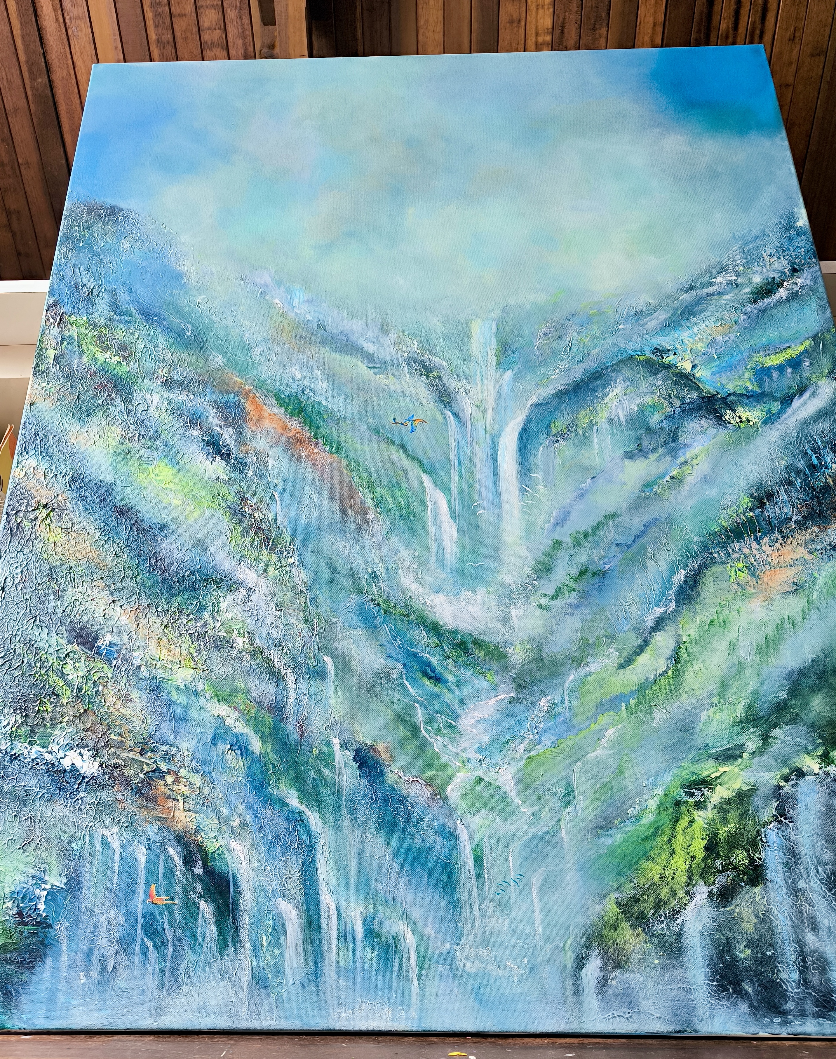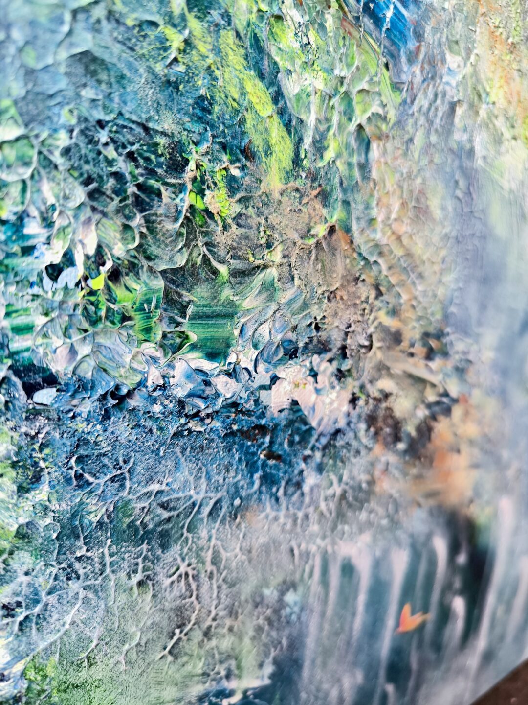J’ai travaillé cette toile en superpositions, mêlant des zones fluides à des textures plus épaisses, avec une palette centrée sur les bleus et les verts. L’envie de suggérer une nature fluide, silencieuse, presque intérieure.